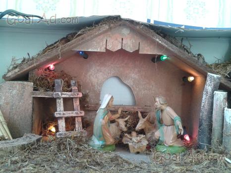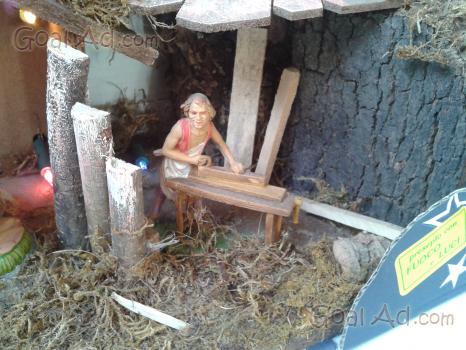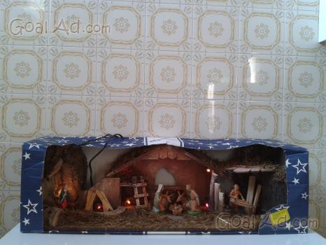 Presepe con 9 luci e 1 fuoco in movimento – Super Square Industries Ltd. Con 2 luci di ricambio. Con sughero, muschio, legno, capanna, Sacra Famiglia, bue, asinello, zampognaro, falegname. Pastori alti 8 cm. Dimensioni: lunghezza: 72 cm; altezza: 21 cm; profondità: 23 cm. Condizioni ottime.