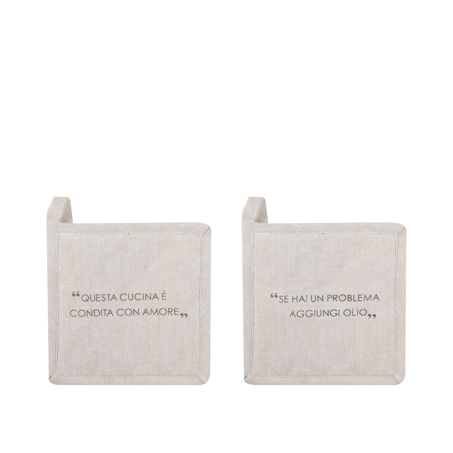 Afferrare tortiere e teglie calde non sarà un problema con questo pratico set di 2 presine da forno. Il rivestimento interno in poliestere unito al rivestimento esterno in cotone isolano il calore, creato con il contatto con accessori caldi o bollenti, preservando le tue mani da scottature accidentali. Potrai così eseguire le tue preparazioni in cucina in tutta sicurezza! In più la bella trama tortora è impreziosita da 2 simpatiche scritte a tema cucina Questa cucina è condita con amore e Se hai un problema aggiungi olio. Potrai appenderle in bella vista tramite asola e abbinarle al guanto coordinato. Lavabile in lavatrice.