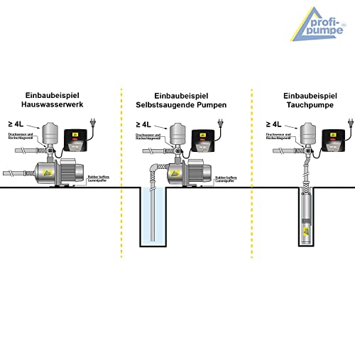 Nota: quando si utilizza il CONTROLLO POMPA INVERTER 5-2.2KW 400V IN / 400V OIUT cablato, DEVE essere utilizzato un vaso di espansione a pressione / serbatoio a pressione. Per il corretto funzionamento, il serbatoio a pressione con un volume minimo di 4L deve essere disponibile nella linea di pressione nelle immediate vicinanze del sensore. Con la selezione di accessori, puoi ordinare un serbatoio a pressione di alta qualità con un piccolo sovrapprezzo.