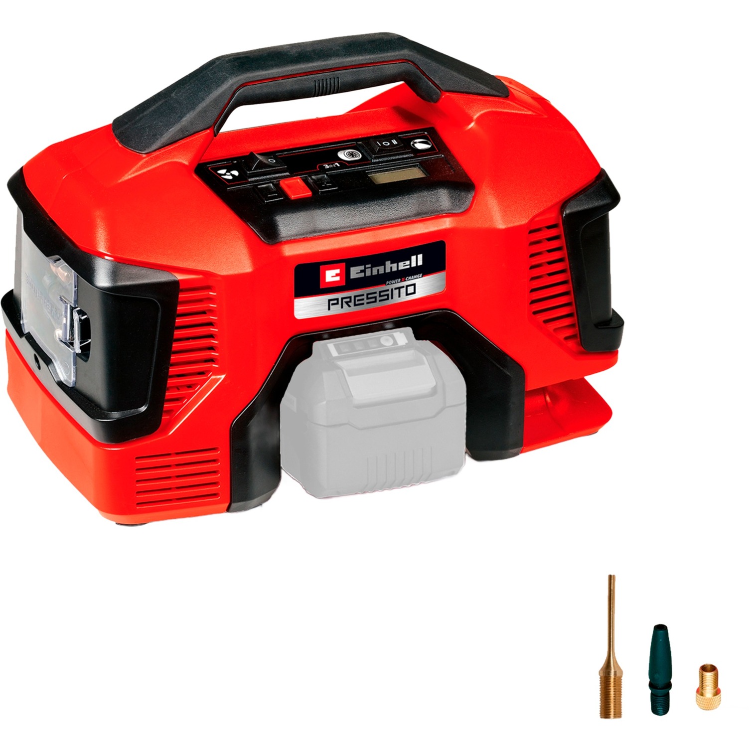 Il compressore cordless Einhell PRESSITO 18/21 è un compressore multifunzione con pompa ad alta e bassa pressione e opzione per l''aspirazione a bassa pressione. Il pratico compressore cordless è alimentato da una potente batteria di sistema da 18 volt della serie Power X-Change, utilizzata anche negli utensili Einhell. Il Pressito con pompa ad alta pressione per gonfiare pneumatici automobilistici e ruota non è solo un''aggiunta perfetta al garage, ma anche ideale per gli spostamenti. Anche nello sport, il compressore è un pratico strumento per gonfiare le palle direttamente sul campo o per l''ultimo controllo gomme prima di un grande viaggio in bicicletta. La pressione massima di esercizio della pompa ad alta pressione è di 11 bar e può essere preimpostata manualmente. Grazie alla funzione Auto Shutoff, il compressore si arresta quando viene raggiunta la pressione impostata. Con la pompa a bassa pressione, i materassi ad aria o i gommoni possono essere gonfiati in pochissimo tempo e l''aspirazione a bassa pressione supporta lo sfiato rapido. Premendo un pulsante, è possibile passare dalla funzione ad alta pressione a quella a bassa pressione. I cavi e i tubi del compressore ibrido sono memorizzati direttamente sul dispositivo in modo che non possano interferire né essere persi. Allo stesso modo, il set di gonfiaggio ha il suo posto fisso sull''alloggiamento. Il compressore ibrido è dotato di un display digitale con indicatore di pressione, il funzionamento manuale è progettato per essere user-friendly. Il compressore a batteria compatto e leggero può essere facilmente riposto ed è ideale come compagno mobile in auto. La consegna è senza batterie e senza caricabatterie. Per utilizzare il compressore cordless PRESSITO 18/21, è necessaria una batteria di sistema da 18 volt disponibile separatamente della serie Power X-Change.
