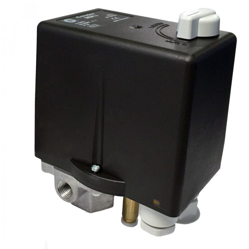 Pressostato per compressori tipo MDR 3/11 con valvola di sicurezza EV 3S e relè di sovracorrente R 3/10 Prodotto di qualità per il funzionamento automatico dei compressori con interruttore on/off. Dati tecnici: Versione Corrente trifase Valvola di sicurezza EV 3S Campo di regolazione 4 - 11 bar Protezione del motore (relè di sovraccarico) R 3/10 carico massimo 6,3 - 10 A Interruttore on/off sì Connessione Flangia F4 G1/2* Capacità di rottura 7,5 kW pressione massima di rottura 35 bar Tipo di contatto contatto NC (3 poli) Temperatura media -da 5 °C a +80 °C Grado di protezione IP 54 frequenza di commutazione massima 120 (elettrica) - 600 (meccanica) * Attacco flangia inferiore G 1/2 (filettatura interna) e 3 x G 1/4 (filettatura interna) a sinistra, a destra e davanti - ad esempio per il collegamento di un manometro o di una valvola di sicurezza. Le connessioni non utilizzate possono essere chiuse con un tappo a vite (non incluso nella fornitura). Valvola di sicurezza Condor EV 3 per