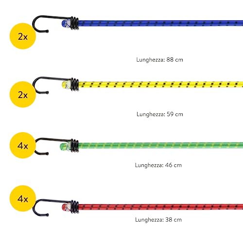 PRETEX Corde Elastiche con Gancio - Set di 12 - Corda Elastica con Gancio per Teloni, Portapacchi, Auto e Bici - Ganci Elastici Portapacchi - 4 Lunghezze - Multicolore
