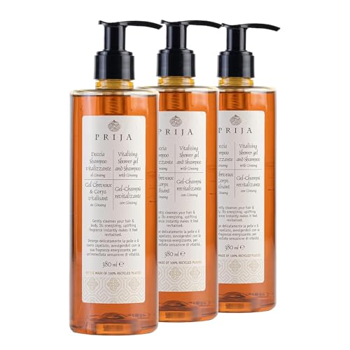 Prija Doccia Shampoo - Detergente per corpo e capelli vitalizzante al Ginseng - Naturale al 100%, Vegan friendly, Dermatologically tested (3 Pezzi)
