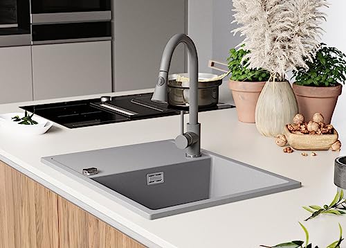 PRIMAGRAN Lavello Composito 62 x 50 cm, Lavandino Cucina 1 vasca + Rubinetto + Sifone Automatico, Lavabo Cucina da Incasso Ibiza 620 Compact, Grigio
