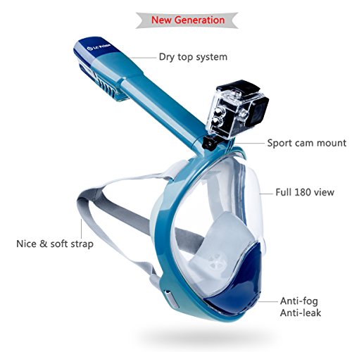 ✔ ANTI-FOG AND ANTI-LEAK DESIGN MASCHERA DA SNORKELING, NICE & SOFT STRAP: Water seal, with exclusive breath ventilation design and no fogging or leaking will be occurred when breathing under water with the full face mask. Adjustable elastic strap for different head size. Sport cam mount built-in, fully compatible with GoPro Hero Camera and SJCAM, easily mount your dive housing on top of the mask. Conveniently take footage during snorkeling from your point of view. (Camera NOT included)