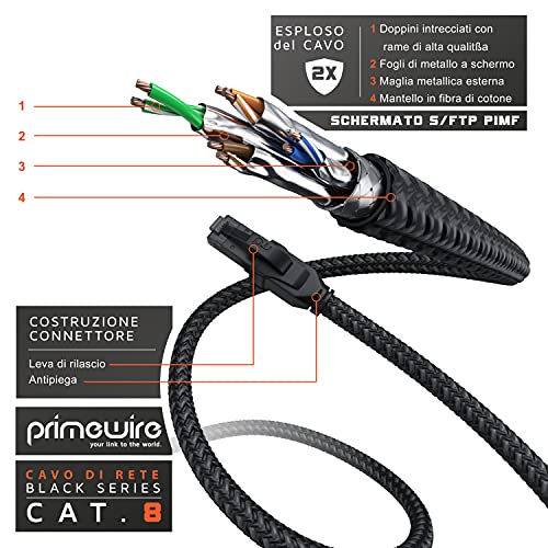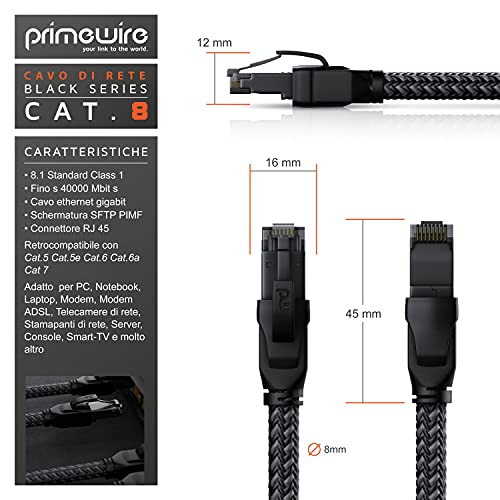 Primewire 2m Cavo di Rete Cat 8.1 40 Gbits - Mantello in Nylon Intrecciato - Ethernet Patch RJ45 - Cavo Cat 8 Gigabit LAN - 40000 Mbits - SFTP PIMF - Compatibile con Cat 6 Cat 7-2 metri