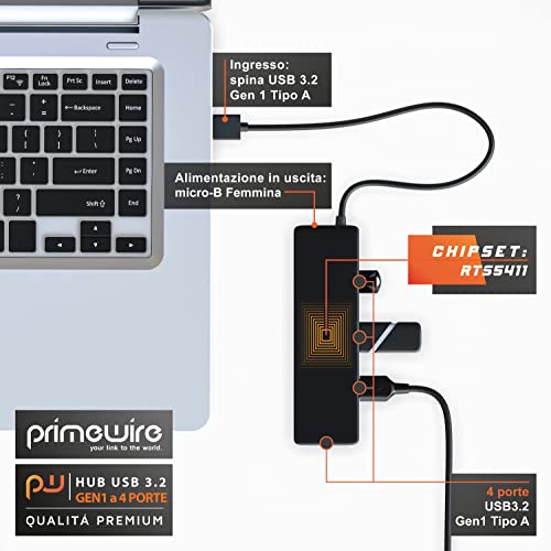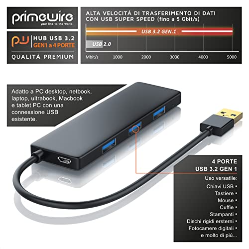 Primewire - Hub USB 3.2 a 4 Porte e Alimentatore - Plug e Play - Hot Plug - Bus Powered - Hot Swap - Blue Power LED - Nero