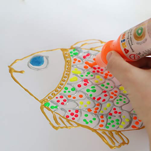 si ricorda che sono tempere bambini lavabili, facili da rimuovere e pulire. Su cartoncino spesso è possibile dosare un colore e poi un altro al suo interno, senza mescolare i colori tra loro. Si otterranno strati sovrapposti e concentrici di colore, un'effetto 3D fantastico!