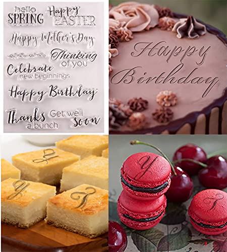 Il pacchetto include: puoi ottenere quattro diversi stili di stampi per timbri per torte (lettere / numeri / frasi / lettere maiuscole e minuscole) e una tavola per timbri.