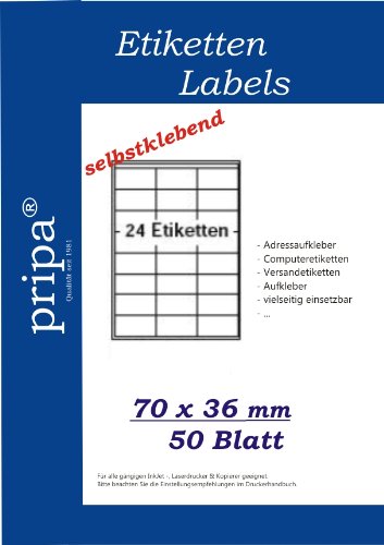 Pripa - Etichette autoadesive da 70 x 36 mm, 50 fogli, formato DIN A4, 24 etichette per foglio