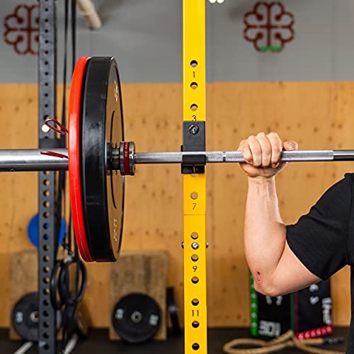 Include 2 ganci a J singoli, rapidamente regolabili in altezza utilizzando i 23 fori su ciascun palo