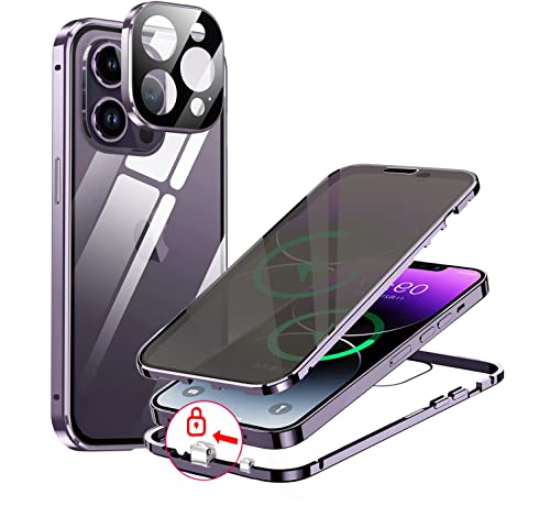 Privacy Cover pour iPhone 14 Pro Anti Spy Custodia,360 Gradi Antiurto Metallo Bumper Vetro Anteriore e Posteriore Doppia Faccia Temperato Anti peeping full body case,Viola