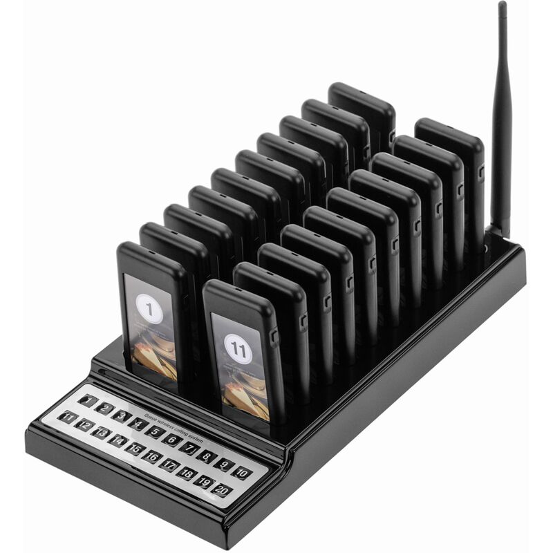 Sistema di comunicazione wireless per la gestione delle code. Il cliente riceve un modulo localizzatore che si attiva emettendo segnali luminosi e vibrando quando il suo ordine è pronto. L'unità wireless viene restituita al momento del ritiro dell'ordine. Ideale per la gestione delle code ed evitare la folla. Caratteristiche del prodotto: CARATTERISTICHE: Base comprensiva di asole per posizionare e caricare moduli localizzatori. Tastiera numerica per programmare il modulo da attivare e far sapere al cliente che tocca a lui. Il localizzatore emette segnali luminosi e vibranti, avvertendo il cliente ed evitando situazioni di disturbo al momento del ritiro dell'ordine. DATI TECNICI: Il kit comprende una base con 20 prese per caricare i moduli. La base contiene 20 cifre come tastierino numerico, attivando il modulo componendo una di esse. L'alimentatore consente l'ingresso di 100-240VAC e l'uscita di 5V a 6A. La frequenza operativa è 433,92 MHz. Include antenna per la base. Sono inclusi