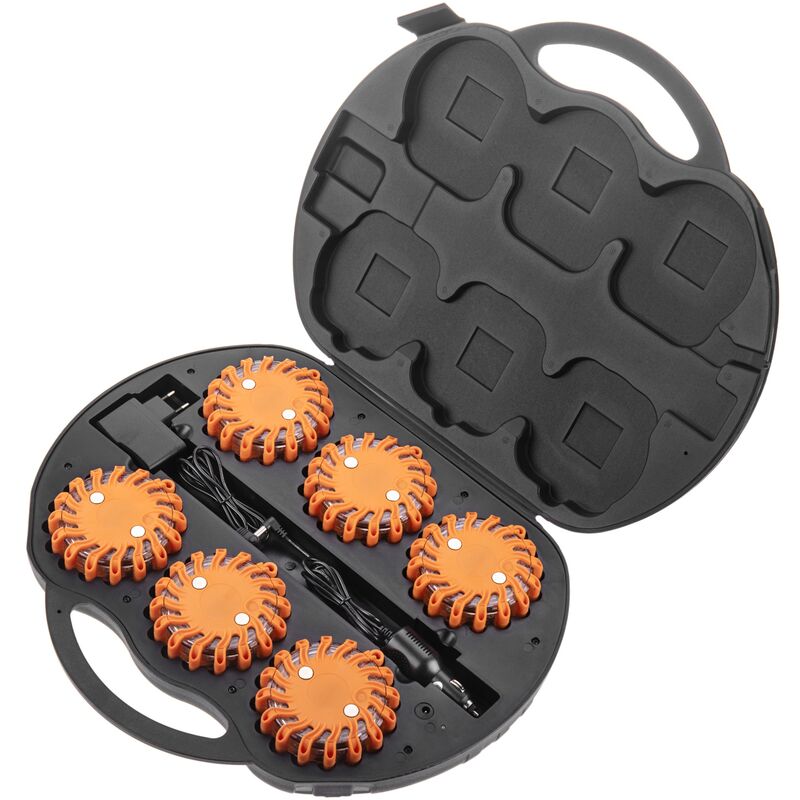 Valigia per il trasporto di segnalatori luminosi a LED. Segnale per segnalare la presenza di un pericolo o delimitare un'area. Luce magnetizzata per aderire ad una superficie metallica senza difficoltà. Dispone di 9 diverse funzioni di illuminazione. La valigia include un caricatore per i fari. Ideale per segnalare pericoli, delimitare spazi, utilizzare come segnalazione della presenza di un veicolo in emergenza, ecc. Caratteristiche del prodotto: SPECIFICHE: Custodia per il trasporto che include spazio per 6 fari a LED arancioni e un caricatore. Il faro emette fino a 9 diversi effetti di luce, attivati da un pulsante. Ognuno ha 16 LED ad alta luminosità. La batteria interna è da 3,7 V e 900 mAh. Faro con magnete da posizionare su superfici metalliche senza pericolo di scivolamento. Protezione IP67 contro l'ingresso di polvere e acqua a una profondità di 1 m e per 30 minuti. Include alimentatore da 220 V CA e caricabatterie per il collegamento a un'auto da 6 V CC. Carica per induzione