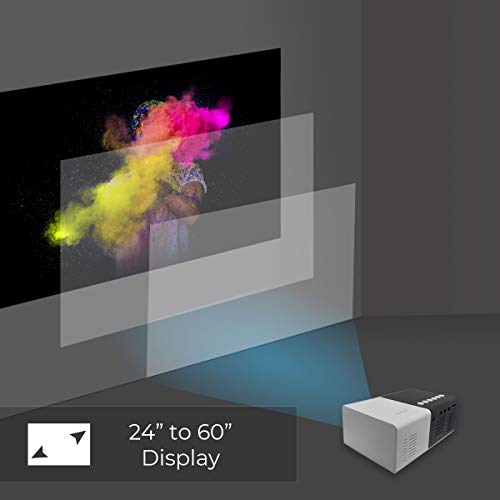 Mini proiettore portatile con 2 altoparlanti stereo integrati e telecomando incluso.