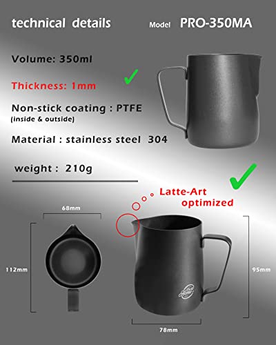 Pro@Home43 Barista lattiera in acciaio inox nero - antracite 350ml (anche 600ml) incl. penna per latte art/lattiera in confezione regalo