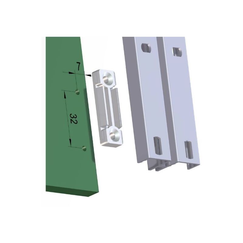 Clip in plastica per il montaggio rapido, a pressione, dei pannelli sui profili predisposti.La clip FORTE e' in nylon bianco ed ha una resistenza allo strappo di circa 35-40 kg.Interasse fori 32 mm. Diametro viti consigliato: 3,5-4 mm. Per il posizionamento della clip bisogna utilizzare la dima R 0030 X.