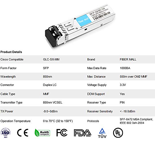 ✿ Ricetrasmettitori SFP 1000BASE-SX conformi a Gigabit Ethrnet, fino a 550 m per trasmissione MMF, compatibili con SFP Multi-Source Agreement e SFF-8472 funzioni di diagnostica digitale, specificato in IEEESFF-8472 MSA Compliant, IEEE 802.3ah-2004.