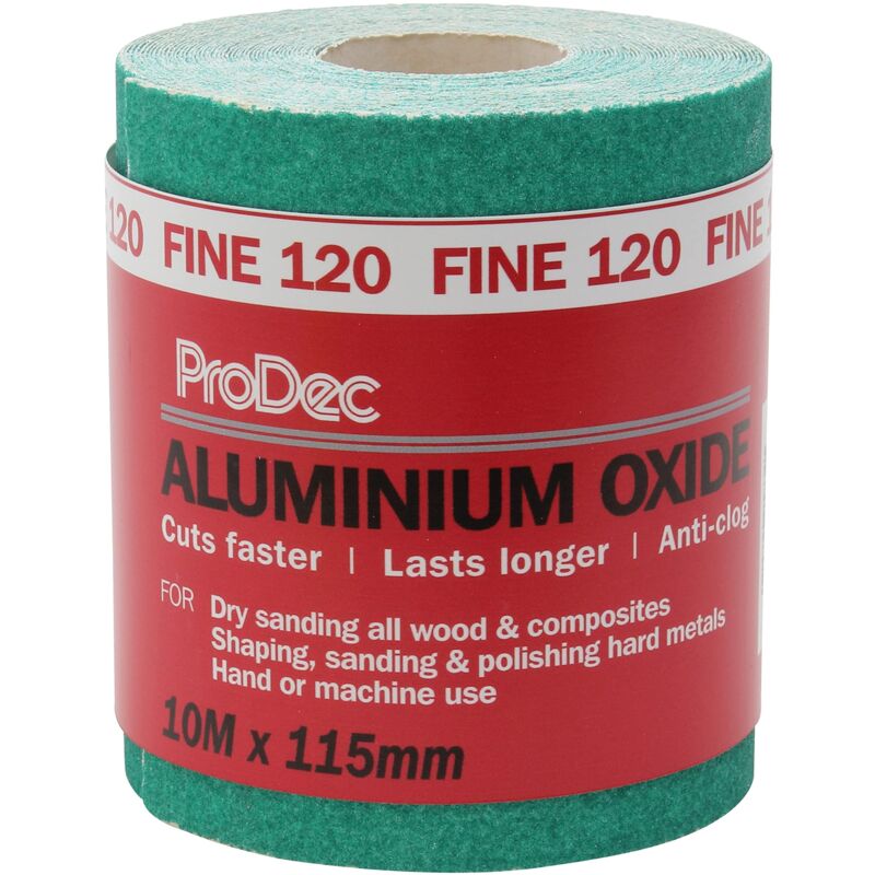 ProDec è il marchio di strumenti e accessori per la decorazione commerciale più grande e più diffuso del Regno Unito. L'ossido di alluminio è la carta abrasiva di scelta utilizzata dai professionisti del settore preferendo la carta vetrata. I granuli di ossido di alluminio sono più resistenti, hanno un'azione autoaffilante e si intasano meno, dando una levigatura ad alte prestazioni che dura fino a 10 volte la carta vetrata. È ideale sia per la levigatura manuale - con o senza blocco di levigatura - che per levigatura a macchina: con una larghezza di 115 mm il rotolo è la larghezza standard per gli utensili elettrici. La carta di supporto E-weight è altamente flessibile e resistente alle crepe, quindi resiste alle pieghe e alle pieghe, rendendola ideale per levigare superfici sagomate o sagomate, oltre ad essere facile da tagliare per l'uso di utensili elettrici. L'ossido di alluminio ProDec è disponibile in una gamma di grane che offrono un'abrasione molto fine o molto aggressiva ed