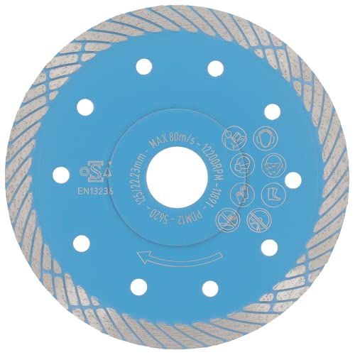 Diametro 125 mm, attacco 22,23 mm, adatto per smerigliatrice angolare delle marche Bosch, Makita, Festool, Flex, Metabo, Würth, Einhell, Hitachi, Milwaukee, DeWalt e altri con mandrino filettato M14, tagliapiastrelle elettrico e guide a batteria, altezza del segmento diamantato 10 mm, extra sottile 1,2 mm per taglio rapido e pulito, strumento professionale. Qualità artigianale artigianale
