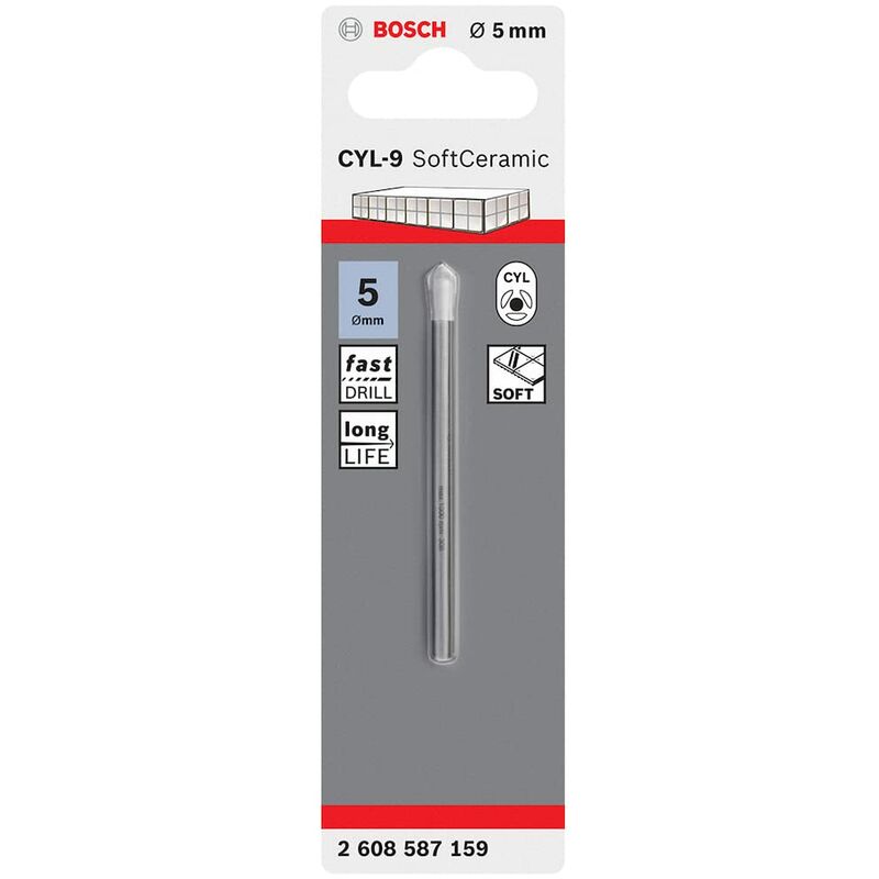 Per la foratura di piastrelle in ceramica La punta CYL-9 SoftCeramic è la scelta ideale per la foratura di piastrelle da rivestimento in ceramica. Design a spirale liscia, ideale per la foratura di piastrelle di durezza media. Foratura senza percussione e a bassa velocità Codolo cilindrico, per impiego senza percussione con trapani a filo o batteria. Dotazione di fornitura: 1x Bosch Professional CYL-9 SoftCeramic punte per piastrelle Ø 5 mm