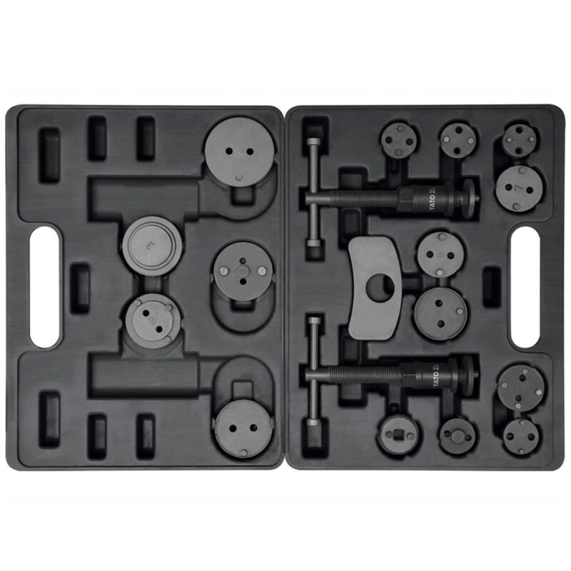 Il set per il disco freno e il calibro è un kit di attrezzi professionale progettato per rimuovere i cilindri della ruota. Lo strumento è composto da due presse a vite, una in senso orario e una antioraria e una serie di piastre per cambiare le ruote per un'ampia gamma di automobili (Citroen: Xm, Xantia;