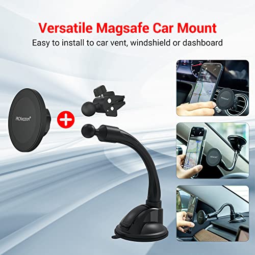 PROfezzion - Supporto magnetico per auto con ventosa per iPhone 13 12 Pro Max Mag Safe Case sul parabrezza dell'auto Dash o Vent Mag, anello di sicurezza incluso per custodia normale User
