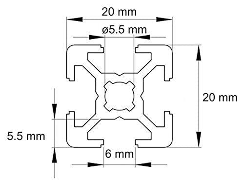 Profilo in alluminio 20 x 20 mm, 4 scanalature, anodizzato 10 µm. Lega:6060T5 AL.