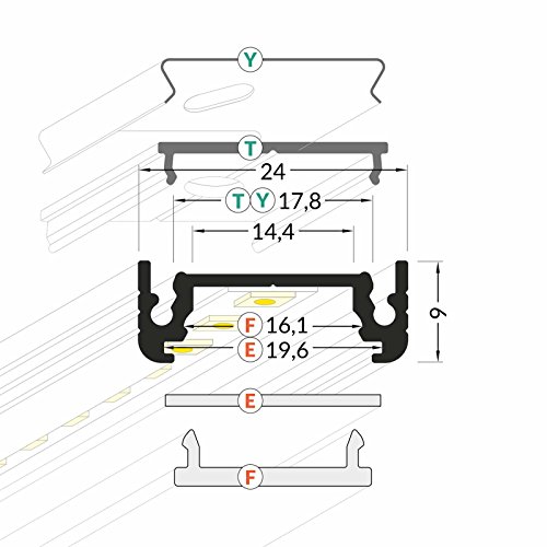 Profilo in alluminio SURFACE14 (SU14), 1 m, profilo in alluminio anodizzato, per strisce LED, set con guida di copertura trasparente, con clip di montaggio e tappi terminali (1 metro trasparente)