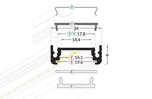 Profilo a LED bianco, struttura 14 in alluminio anodizzato, per strisce LED da 2 m, con copertura latte, per strisce LED fino a max. 14 mm (bianco, 2 m di latte)