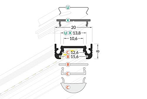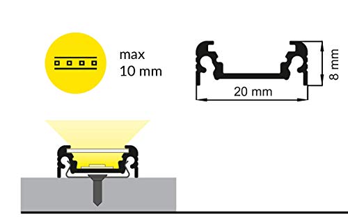 Profilo LED Surface10 in alluminio anodizzato per strisce LED da 2 m, con lente di copertura, per strisce LED fino a max. 10 mm (bianco, 2 m clic lente)
