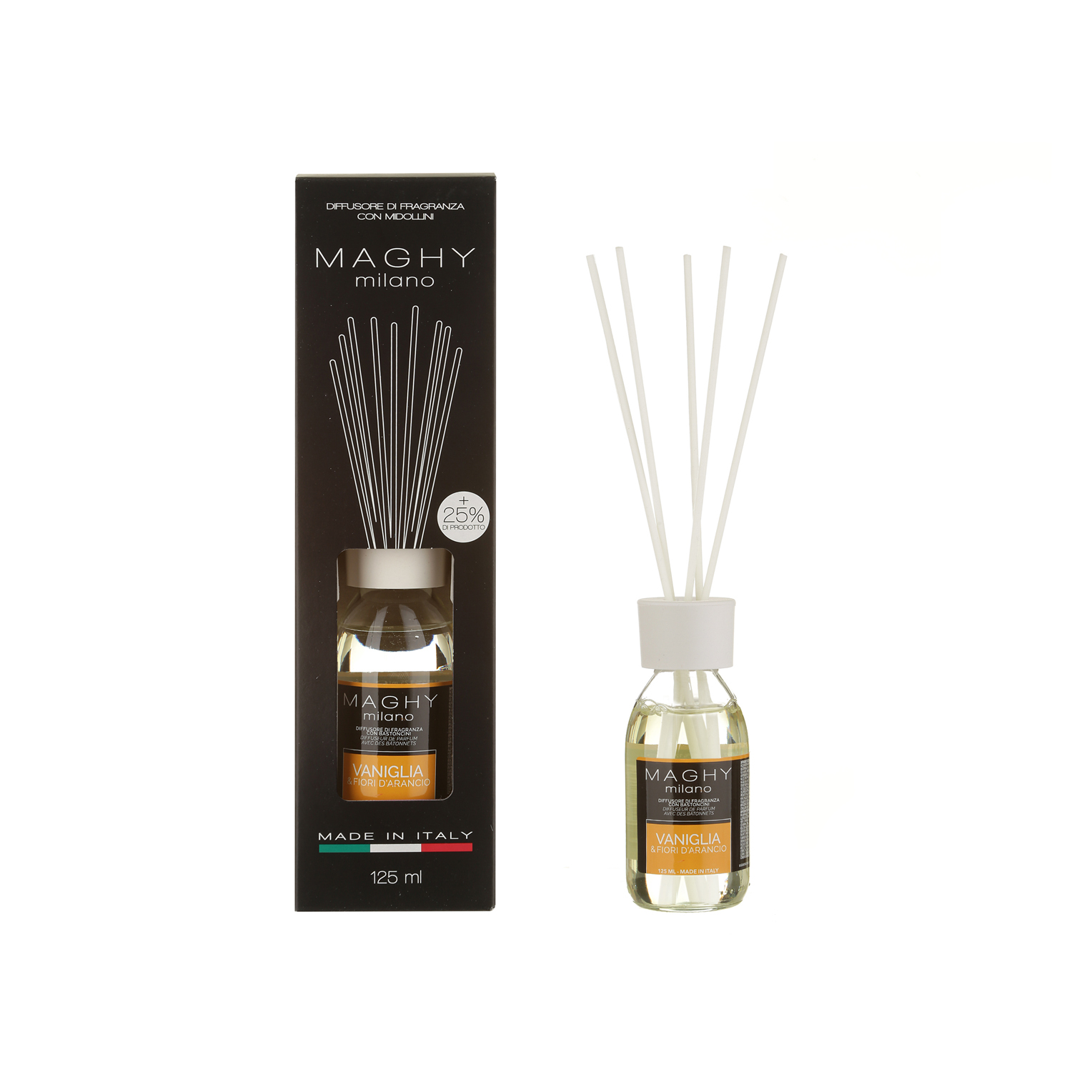 Fragranze uniche e inimitabili entreranno a far parte della vostra casa donandovi ogni istante una dose di relax olfattivo. Un aroma unico in una confezione elegante e raffinata, forme e materiali che cercano la sobrietà nel contrasto tra colori. Rendete unici ambienti lavorativi o domestici con le fragranze Maghy, perfette per cullare i vostri sensi verso un'oasi di aromaterapia. La struttura in vetro permette una perfetta stabilità, consentendovi di posizionare il profumatore e mantenere in completa autonomia le bacchette in legno. La diffusione dell'aroma è garantita dalle bacchette in legno che assorbono e rilasciano la fragranza nell'aria.