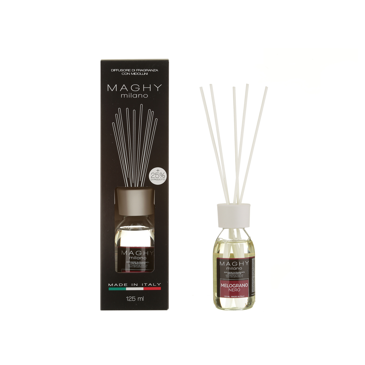 Fragranze uniche e inimitabili entreranno a far parte della vostra casa donandovi ogni istante una dose di relax olfattivo. Un aroma unico in una confezione elegante e raffinata, forme e materiali che cercano la sobrietà nel contrasto tra colori. Rendete unici ambienti lavorativi o domestici con le fragranze Maghy, perfette per cullare i vostri sensi verso un'oasi di aromaterapia. La struttura in vetro permette una perfetta stabilità, consentendovi di posizionare il profumatore e mantenere in completa autonomia le bacchette in legno. La diffusione dell'aroma è garantita dalle bacchette in legno che assorbono e rilasciano la fragranza nell'aria.
