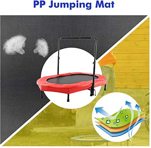 【ROBUSTO E IMPERMEABILE】: telaio robusto, tappetino da salto in PP, copertura protettiva in PVC, molle in acciaio inossidabile, tubo per gambe gommato e impugnatura ricoperta di schiuma - evita che la ruggine venga esposta nei giorni di pioggia e Fornire un ambiente più sicuro per i bambini, ideale per bambini dai 3 anni in su.