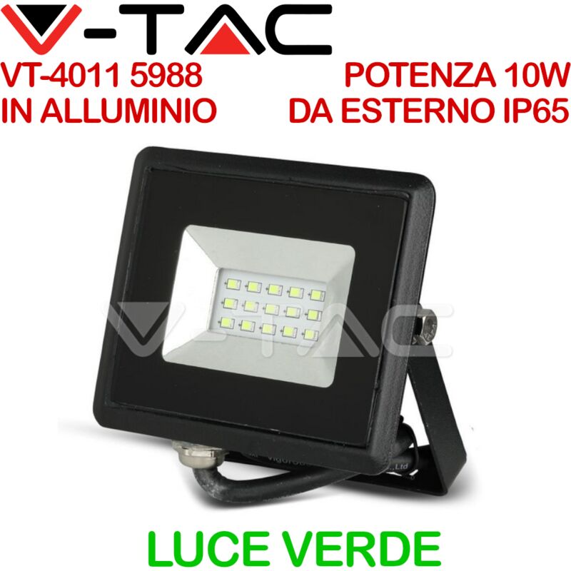 10W LED Proiettore SMD E-Series Corpo nero luce verde IP65 SKU: 5988: VT: VT-4011 Caratteristiche del prodotto .Bianco freddo, naturale, caldo .Migliore Qualit del corpo in lega di alluminio .Resistente alla corrosione .Maggiore impermeabilit /ermeticit dell involucro in vetro, sigillato con gomma siliconica .Migliore Qualit dei componenti LED .Integrato di Driver a corrente costante .Integrato di Alimentazione, non necessario trasformatore esterno Installazione .Passi carrai .Giardini .Cartelloni .Campi sportivi .Parcheggi etc. Specifiche tecniche ~: Informazione generale = ~:Tipo LED=SMD~:Vitamedia=20000 ore~: Dati elettrici = ~:Potenza=10W~:Tensione=AC: 220-240V~:Frequenza=50/60Hz~:Fattore di potenza=50/60Hz~: Dati tecnici luce = ~:Fascio Luminoso°=110°~:Colore della luce=Verde~:Indice di resa cromatica Ra=>70~: Dettagli corpo = ~:Colore=Nero~:Materiale=Alluminio~: Funzionalità = ~:IP Protezione=IP65~:Tempo innesco 100%=0.001 secondo~:Stabilità del