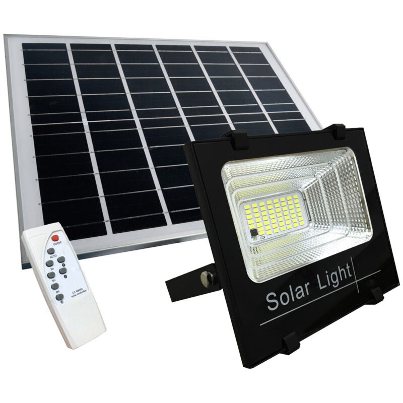 Proiettore Faro a energia solare 60w con pannello solare incluso DIMMERABILE Si tratta di un proiettore di ultima generazione che viene alimentata non a corrente elettrica diretta ma bensì a energia solare, una nuova tecnologia ancora più ecologica ed economica! La combinazione tra illuminazione a LED ed energia solare permette di risparmiare ulteriormente sui consumi elettrici. I pannelli fotovoltaici sono prevalentemente realizzati con materiali che sono noti per avere la proprietà di convertire naturalmente la luce solare in energia elettrica. La tecnologia del proiettore permette di immagazzinare energia elettrica prodotta dai semiconduttori del pannello fino a 8h circa di autonomia in assenza di energia solare diretta. Il faro proiettore è dotato di sensore crepuscolare: si spegne in presenza di luce e si accende in assenza di luce. L'elevato grado di protezione IP65 sia del pannello che del proiettore li consente di essere posizionati in spazi esterni, quali giardini, terrazze