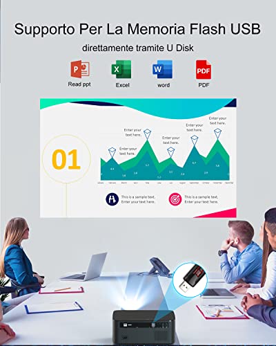 【POWERPOINT SUPPORTATO, 100000 ORE DI DURATA DELLA LAMPADA】Proiettore Bluetooth WiFi, leggi PPT, PDF, Excel, Word e altri file direttamente dalla chiavetta USB, il proiettore home theater è dotato di multi-interfacce HDMI, AV, USB e uscita audio da 3,5 mm, che è compatibile con IOS/Android/Laptop/Macbook/Lettore DVD/PS5/TV Box. Utilizza la tecnologia più recente per ridurre al minimo il con