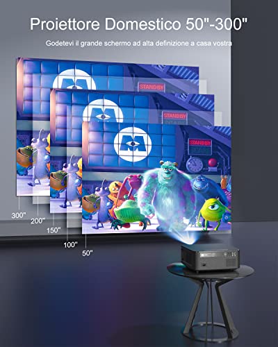【CORREZIONE KEYSTONE 4P, FUNZIONE ZOOM -50%】 Il mini proiettore Bluetooth WiFi supporta la funzione di correzione trapezoidale a 4 punti , È possibile regolare i quattro punti dello schermo separatamente per ottenere un migliore effetto di visualizzazione. Display da 50" a 300",La distanza di proiezione è 1,54m-7m。Funzione zoom dal 50% al 100%, è possibile modificare le dimensioni dell'immagine a piacimento senza dover spostare il videoproiettore