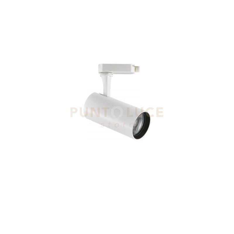 Proiettore cilindrico in alluminio estruso, adatto per installazione su binario trifase. Verniciatura a polveri, testata girevole 350° e orientabile fino a 90°;