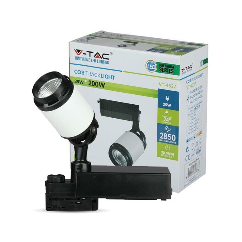 35W Proiettore a pista LED Corpo Nero/Bianco 6400K SKU: 1340: VT: VT-4537 Caratteristiche del prodotto Disponibile da 10W fino a 45W 80% di Risparmio energetico Nessuna emissione di raggi ultravioletti o infrarossi Totalmente flessibile, compatto e dal design regolabile Eco-compatibile in quanto privo di Piombo o mercurio Radiosità uniforme e adattabile a qualsiasi ambient Prestazioni superiori garantite rispetto alle versioni alogene precedenti ad alto wattaggio e alle HID lights, nelle installazioni Commerciali e al dettaglio Installazione Ottimale negli Stand espositivi Gallerie Hotel, Bar Illuminazione Commerciale & Residenziale Specifiche tecniche Informazione generale Tipo LED COB Vita media 20 000 ore Dati elettrici Potenza 35W Potenza EQV. a incandescenza 200W Tensione AC: 220-240V Frequenza 50Hz Fattore di potenza > 0.9 Dati tecnici Luce Colore della luce Bianco Temperatura di colore 6400K Flusso luminoso 2850 lm Indice di resa cromatica Ra > 80 Fascio Luminoso 24 ° Dettagli