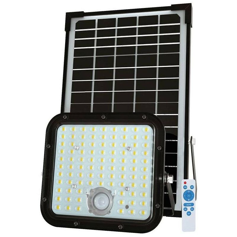 Proiettore solare a Led Elcart E-Motion300 composto da: Un proiettore Led ad alta efficienza con ottica secondaria diffondente per ampliare l'area illuminata al suolo Batteria integrata ricaricabile di ultima generazione al Li-Ion Pannello fotovoltaico monocristallino per aumentare il rendimento anche in situazioni di scarso irraggiamento solare 1 Telecomando per il controllo remoto delle funzioni del proiettore 1 Sensore PIR di movimento Accessori per l'installazione Specifiche tecniche: Capacità Batteria 6000 mAh Temperatura Colore 4000 Kelvin Peso 1,60 KG Cri 70 Angolo Emissione 120 gradi Colore Bianco naturale Flusso Luminoso 4800 LM Grado IP65 Il proiettore Led è dotato di una centralina e di un sensore PIR di movimento che garantisce nella modalità "Auto" una gestione SMART dell'illuminazione e di un telecomando per la gestione delle diverse modalità garantendo un funzionamento superiore alle 40 ore a seconda dello stato di carica della batteria. ATTENZIONE: si consiglia di