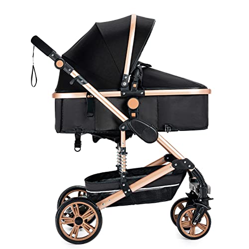Prokoke Passeggino Trio, Passeggino 3 in 1 con Una Lega di Alluminio a Cornice, Trio Passeggino Neonati con Design Pieghevole in Un Clic, Trio con Due Modi Reversibili per Spingere (739 Black Gold-3)