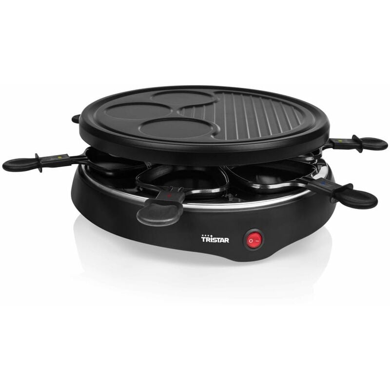 La griglia per raclette della Tristar con le sue 6 padelle gourmet e una piastra grill con 3 forme di crepe è l'ideale per preparare deliziose crepe, pancake o frittate, mentre grigliate carne e verdure nelle padelle o sulla piastra grill. Questa versatile piastra elettrica serve per fino a 6 persone. Poiché è possibile utilizzare contemporaneamente la piastra grill e le padelle piccole, ognuno può scegliere come desidera preparare il proprio cibo. Cuocete un uovo modulo sul piatto grill, grigliate un pezzo di carne sul piatto grill e cuocete alcune verdure in una padella! Questa raclette ha un diametro di 29 cm e la forma rotonda consente a tutti di raggiungere facilmente il piatto. Potete farla funzionare facilmente usando l'interruttore on / off e la spia luminosa vi mostra quando viene raggiunta la giusta temperatura. La raclette si riscalda rapidamente grazie alla sua potenza di 800 W. È facile da pulire grazie al rivestimento antiaderente e alla piastra staccabile della griglia.