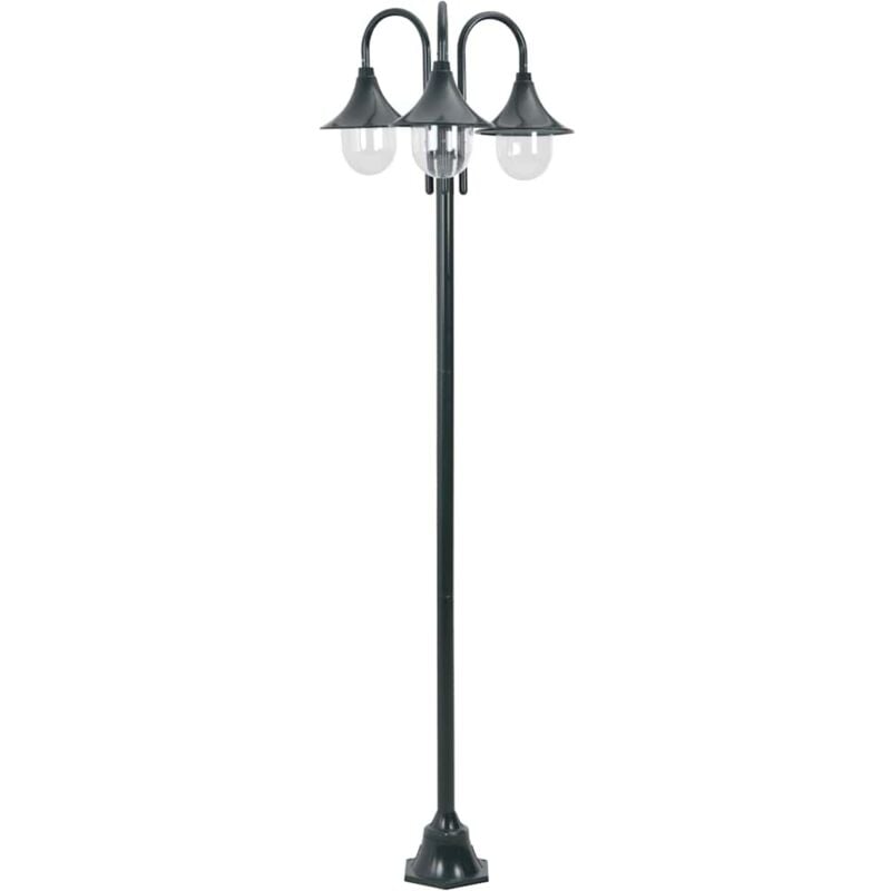 Questo lampione da giardino con 3 lampade è adatto a tutti coloro che desiderano illuminare il proprio giardino con un'illuminazione funzionale, sicura e di atmosfera e per i quali la qualità e la durata sono fattori fondamentali. Questo lampione da esterni di alta qualità è realizzato in alluminio resistente con paralume in PVC e garantisce anni di utilizzo. Il lampione può ospitare 3 lampadine con attacco di tipo E27. Si prega di notare che le lampadine non sono incluse nella consegna. Colore: Verde scuro Materiale: Telaio in alluminio + paralume in PVC Dimensioni totali: 63 x 63 x 220 cm (L x P x A) Numero di lampade: 3 Diametro di ciascuna lampada: 25 cm Attacco lampada: E27 Alimentazione: 220-240 V~, 50 Hz Adatta a 2 lampadine a LED da 60 Watt (non incluse) Classe di protezione in ingresso: IP44 Lampadine non incluse