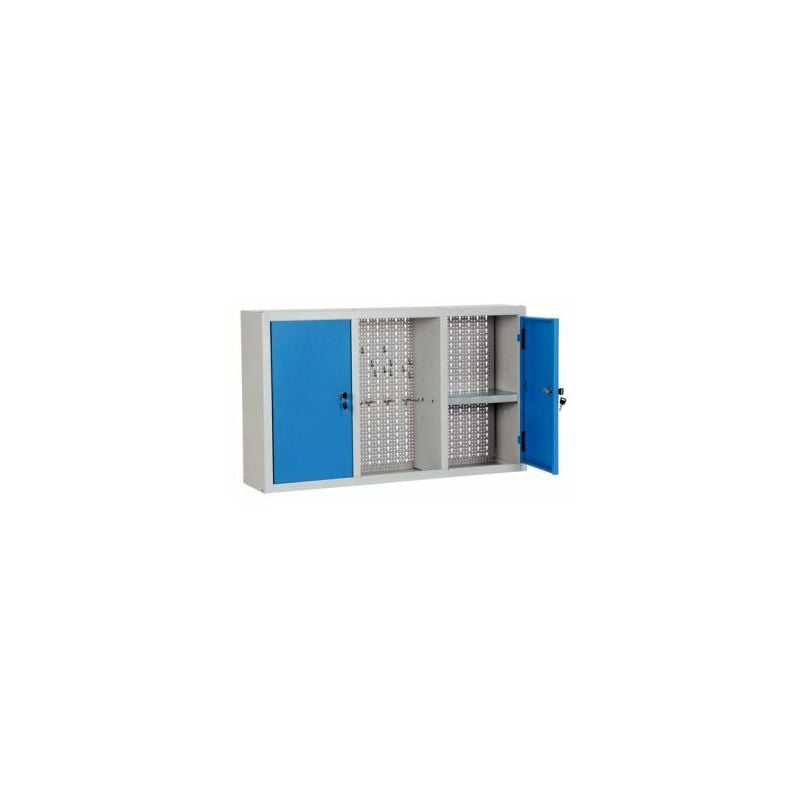 ARMADIO PORTAUTENSILI 2 ANTE CON PANNELLO FORATO Creato per custodire gli utensili e i piccoli attrezzi di uso quotidiano. Utile in garage officine o laboratori fai da te. Realizzato in lamiera pressopiegata e profilata a freddo. Rivestimento superficiale di rifinitura previo pretrattamento di fosfosgrassaggio con fosfati di ferro a protezione e preparazione della successiva verniciatura finale reticolata in forno continuo 160/180° C. Dimensioni: H 600 - L 1000 - P 240 mm Elementi da assemblare: tetto;