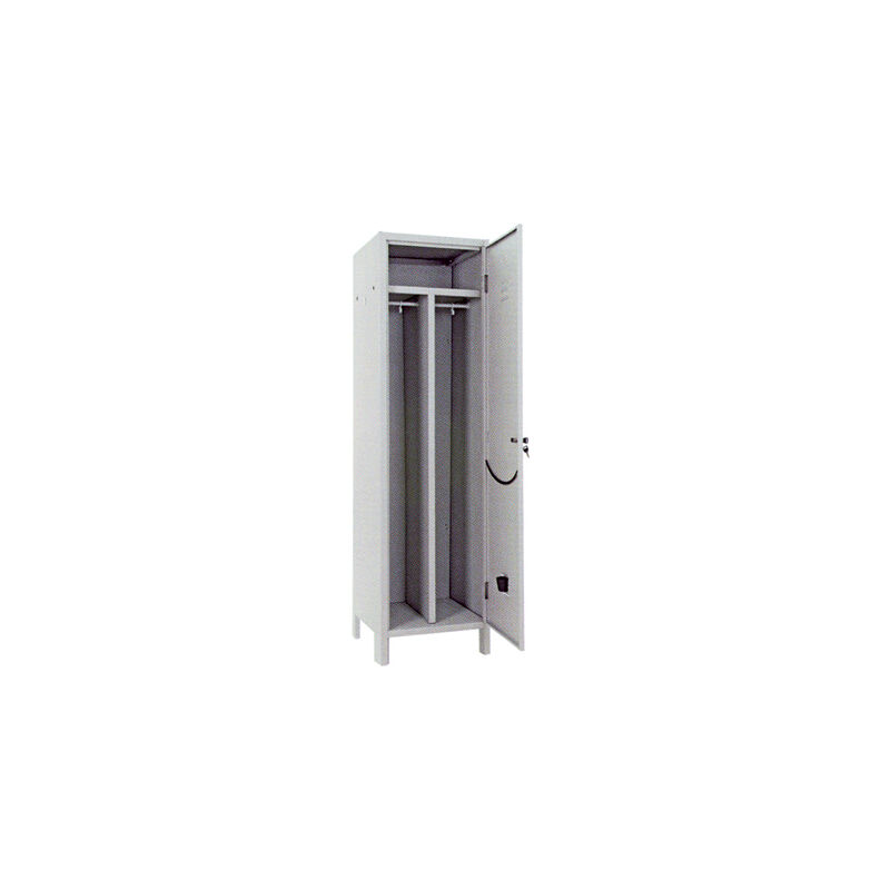 In lamiera di acciaio pressopiegata, con pretrattamento di fosfosgrassaggio e verniciatura a forno continuo. Colore grigio RAL 7035. Allestito con porta asciugamani, appendiabiti, ripiano interno, feritoie, portacartellino e paratia centrale. Con serratura a cilindro con doppia chiave in dotazione. Da assemblare.