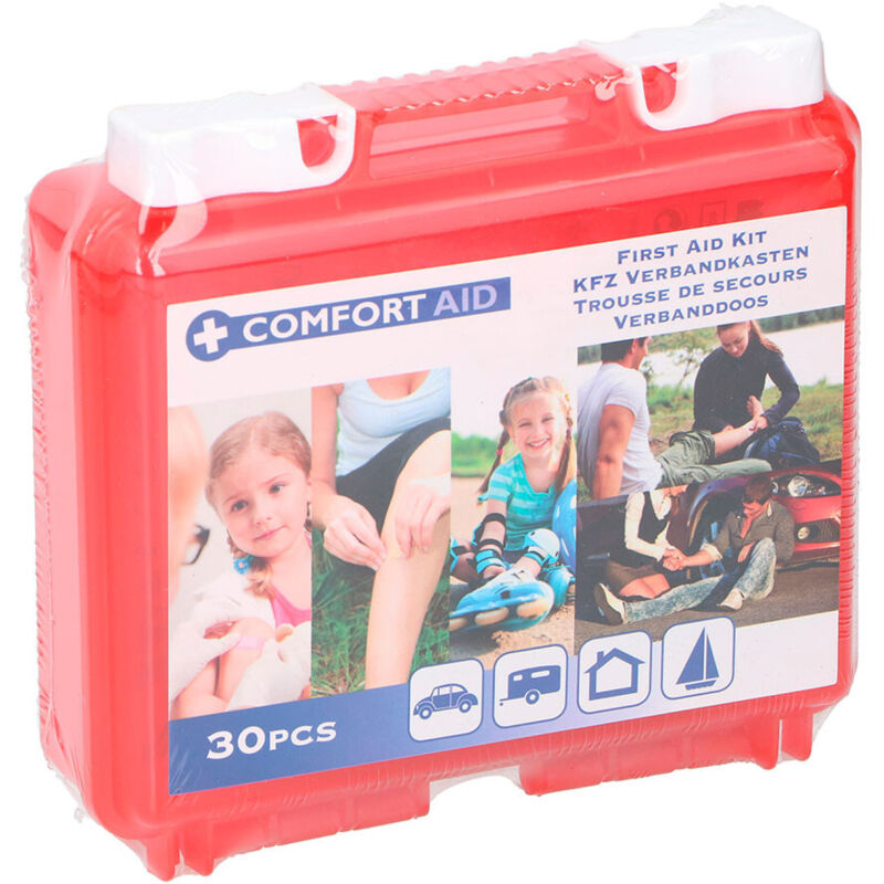 Il kit di pronto soccorso 30 pezzi comprende 1 coperta termica, 4 confezioni di garze, cerotti assortiti, 1 paio di guanti, 10 bende di cotone e forbici.