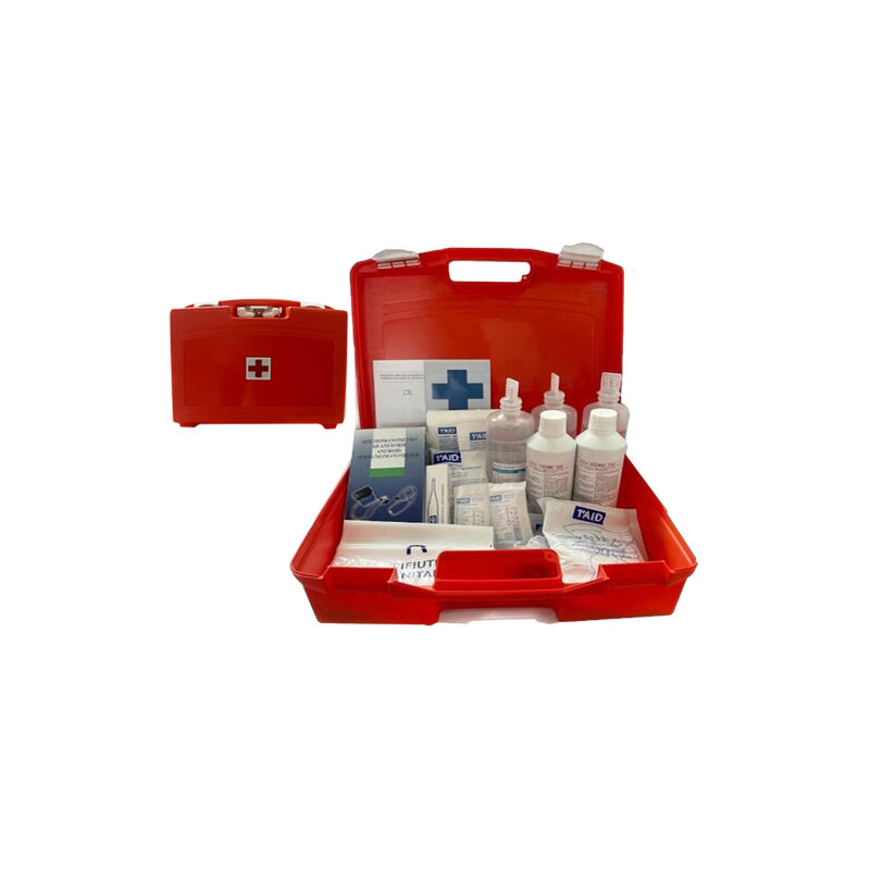 In polipropilene 44x34x12 cm.. chiusura a scatto. Dotata di supporto per attacco a parete. Contenuto 20 referenze per prime operazioni di soccorso. Per aziende del gruppo AB con più di tre lavoratori. Per il contenuto consultare la scheda tecnica