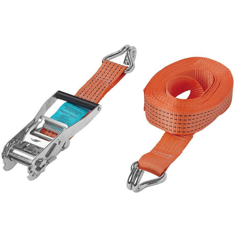 Questa cinghia di fissaggio è ottima per aiutare a fissare carichi grandi o fragili. Questa cinghia a cricchetto ha 2 ganci. È lunga 8 metri ed è adatta per carichi fino a 5000 kg (DIN 12195). 2 ganci 8 metri 5000 kg