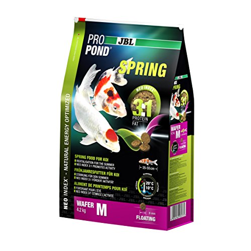 Contenuto della confezione: 1 x JBL 4,2 kg, ProPond Spring, mangime primaverile per carpe Koi, galleggiante, 4121700, taglia M, sacchetto richiudibile ermetico e impermeabile.